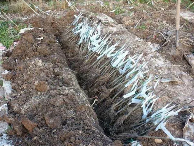 Для этого достаточно выбрать место и выкопать траншею, ориентированную с востока на запад, глубиной порядка 50-70 сантиметров. Причём северный край траншеи нужно сделать отвесным, а южную часть пологой. Перед укладкой саженцев в траншею следует удалить с них все листья, а также повреждённые ветви и корни, после чего поставить в чистую воду на 3-4 часа, а в почву можно добавить торф и песок. Это нужно для того чтобы «напоить» растения водой и обеспечить лёгкую почву, чтобы весной их было проще откопать. Укладывать их в траншею следует корнями к северному краю, а верхушками к пологому, на юг. Корни засыпают песком либо торфом на высоту приблизительно 20 сантиметров и затем поливают. В таком виде саженцы будут храниться до первых заморозков, после чего траншея засыпается грунтом. Во время сильных морозов наземную часть лучше укрыть лапником, снегом либо просто землёй.