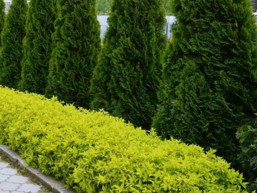Для вечнозелёных изгородей, не опадающих на зиму, высаживают тую, ель, можжевельник. Такие саженцы обходятся несколько дороже и растут значительно медленнее, но они удобнее в уходе, не требуют частой стрижки и прекрасно держат форму.