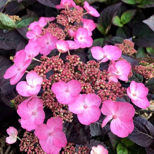 У этого сорта гортензии соцветия находятся на концах побегов и имеют плоскую форму. Размер соцветий небольшой, но их окраска весьма впечатляет. Изначально цветки темно-розовые, а в конце цветения они становятся винно-красными. Отличительной чертой является способность изменять окраску в зависимости от типа почвы - на кислой почве цветы окрашены в темно-пурпурный цвет.