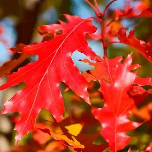 Листья длиной до 20см, на них глубокие выемки, заостренные лопасти со всех сторон, узкой форма, блестящие. Когда остролистный дуб распускается, они имеют немного красный оттенок, летом зеленого цвета, осенью у молодых саженцев шарлахово-красный цвет, а у старых буро-коричневый.