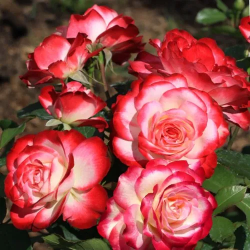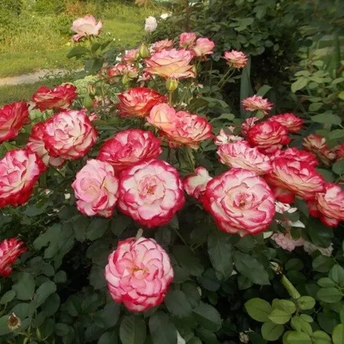 Главная особенность сорта — цветение. Бутоны раскрываются в кремово-белые цветки диаметром 8–10 см, по краям лепестков — насыщенная малиново-красная кайма, которая становится ярче при прохладной погоде. Цветы махровые, до 35 лепестков, держатся долго, не выгорают, не загнивают под дождём. Собраны в соцветия по 3–5 штук. Цветение идёт волнами с начала лета до осенних заморозков без перерывов. Аромат лёгкий, свежий, практически неуловимый — идеален для чувствительных к запахам садоводов.