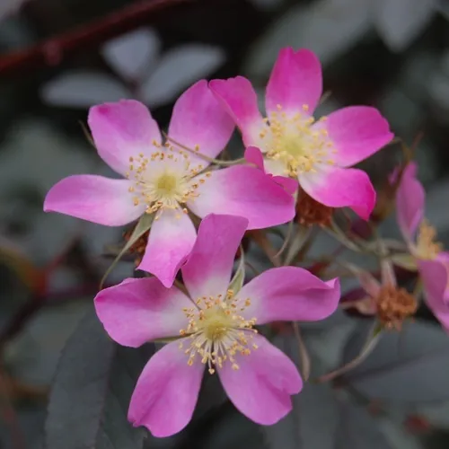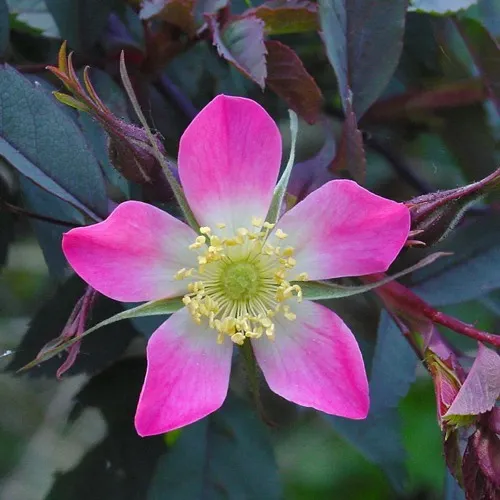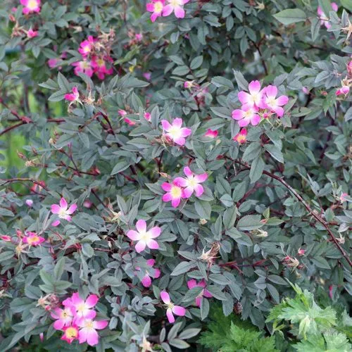 Высота куста — до 2,5–3 м, форма — раскидистая, но не агрессивная. Побеги тонкие, прямостоячие, покрыты редкими шипами. Цветки — простые, розово-лиловые, некрупные, но яркие, распускаются в июне–июле и сохраняются до середины лета. Плоды — вытянутые, алые, висят до морозов, не осыпаются, и отлично смотрятся на фоне сизой листвы. Привлекают птиц и пчёл.